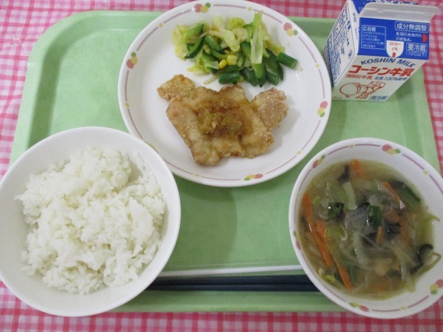 今日の給食はにんにく、しょうが、ねぎを使って香味ソースを作り、揚げた鶏肉の上にかけて食べました。