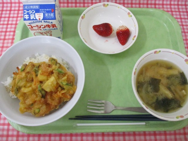 今日のかき揚げには、えび・いか・にんじん・たまねぎ・さやいんげんが入っています。調理員さんがひとつひとつ丁寧に成形して揚げてくれました。感謝の気持ちをもち、味わっていただきましょう。