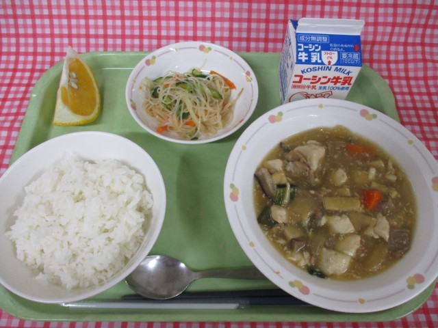 八宝豆腐の「八宝」とは「おいしいものがたくさん」ということで、海のもの山のものがふんだんに使われた料理です。「甘夏」は3月から5月ごろに旬を迎える、みかんの仲間です。酸味とともに甘味があり、さっぱりとした味が楽しめます。甘夏に豊富に含まれているビタミンCには、皮膚や血管を丈夫にしたり、かぜなどを予防したりする働きがあります。上手に皮をむいて食べましょう。