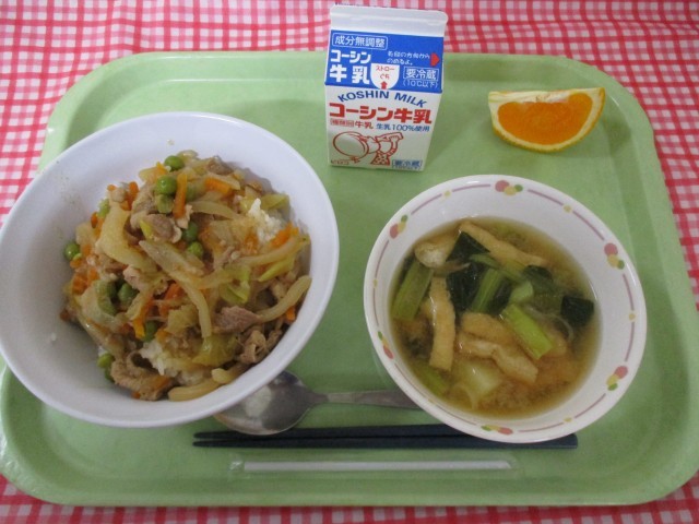 今日の給食で、春が旬の食べ物は、玉ねぎやグリンピース、じゃがいも、清見オレンジなどがあります。