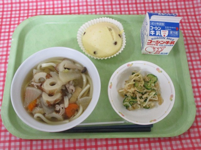 栄養バランスの良いうどんです。付け合わせに、さっぱりとカルシウムを補える「切干大根のごま酢和え」とエネルギー