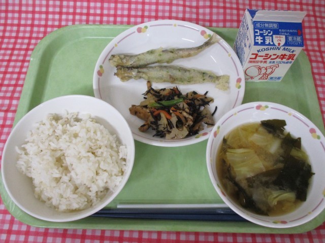 主菜のししゃもは、頭から丸ごと食べることができる魚で、カルシウムを多くとることができます。