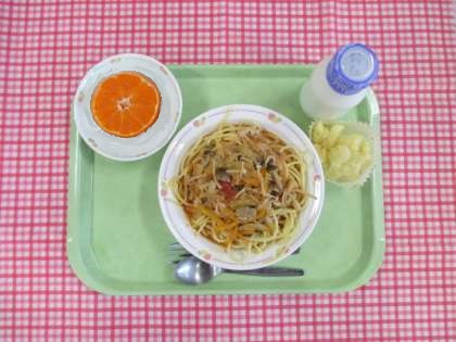 今日は、鶏肉やえび、旬のきのこをたくさん使ったスープスパゲティです。主な味つけはトマトジュースやトマトケチャップを使いました。バターやチーズを少量入れることでコクが出るように仕上げました。