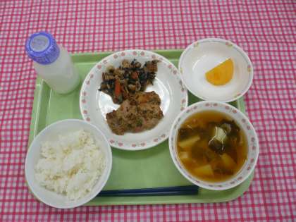 *今日の副菜にはひじきが入っています。ひじきは海藻の仲間です。干した物を水にもどして煮るとねばりが出ておいしくなります。鉄分やカルシウムが多く含まれ、血を作る大切な働きがあるので、どんどん食べるといいですね。