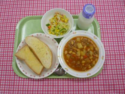 *チリコンカンはアメリカの豆料理です。今日は大豆を使っています。大豆は畑の肉といわれるほど、体に良い物ですから、たくさん食べるようにしましょう。