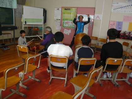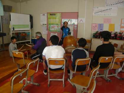 音楽室でたけのこ学級が和太鼓と締太鼓を使って、