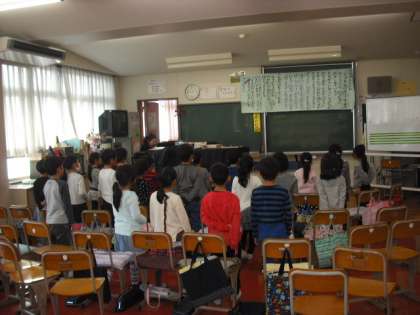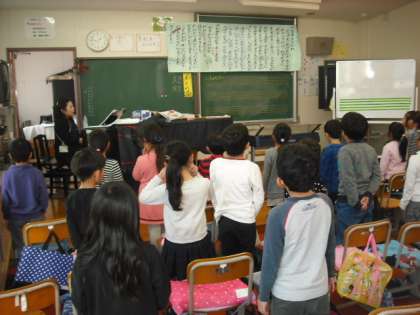 1年生が音楽朝会の曲「トゥモロー」を歌っています。