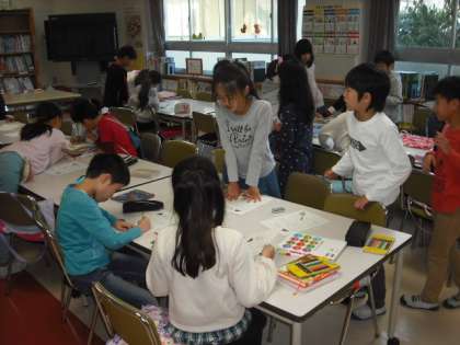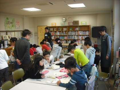 4年生の図書館タンテイです。 グループごとに相談して、 問題に挑戦しています。