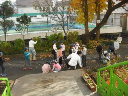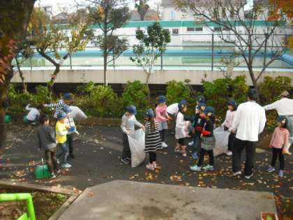 3年生以上の児童は清掃時間に落ち葉掃きをしています。