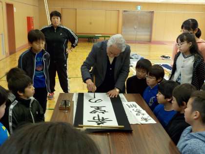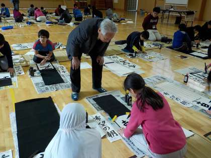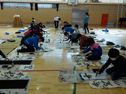 体育館で席書会をしました。「希望の朝」という文字を書きました。