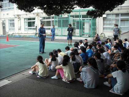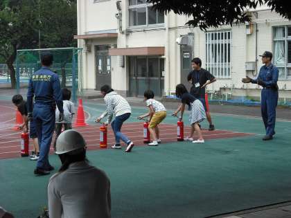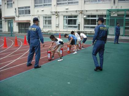 避難訓練を行いました。5年生と6年生が消火器訓練を行いました。