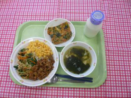 *今日は世界の料理特集で韓国料理です。韓国は日本に一番近い外国です。ごはんの上にちょっとピリ辛の豚肉や野菜や卵をのせ、まぜて食べます。チヂミは韓国版のお好み焼きです。韓国料理はゴマ油と唐辛子がきいた辛い料理が多いですが、血液をサラサラにする効果があり、体によいとされています。
