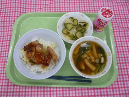 *今日で1学期の給食が終わりです。リザーブ給食を行いました。てりやき丼かカツ丼のどちらかを事前に選んで今学期最後の給食を楽しみました。てりやき丼は159人、カツ丼は190人でした。