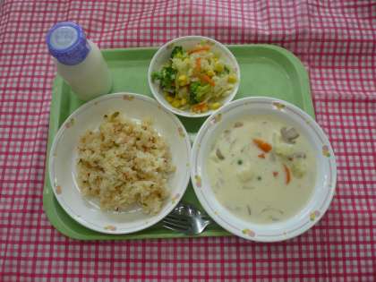 *今日のサラダにはブロッコリーが入っています。ブロッコリーはカリフラワーと似た仲間ですが、違うところがたくさんあります。カリフラワーは花を食べますが、ブロッコリーはつぼみを食べます。栄養をくらべても、ビタミンCやAが多く、かぜなど病気にかかりにくくする働きがすぐれています。