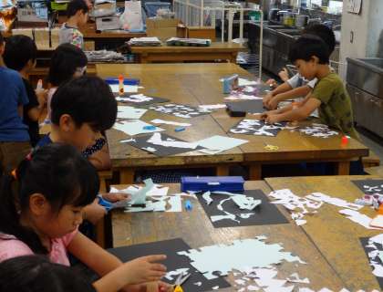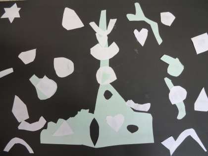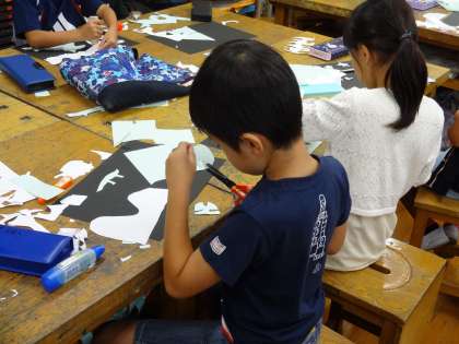 1年生の図画工作の授業では、ハサミを使っていろいろな形をつくり、気に入った形を組み合わせて1枚の作品をつくりました。偶然できた形をいろいろなものに見立てながら、楽しく活動することができました。