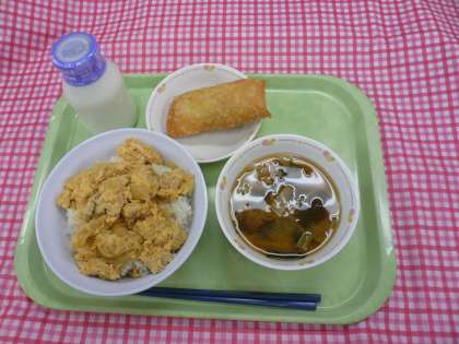 *今日のあぶたま丼は親子丼に似ていますが、豚肉と油揚げと玉ねぎを甘辛く煮て、卵でとじたものです。ごはんにのせて食べるととてもおいしいです。カボチャの包み揚げはカボチャを蒸してつぶしたものと、ベーコンと玉ねぎをいためたものを混ぜて春巻きの皮で巻いたものを揚げたものです。