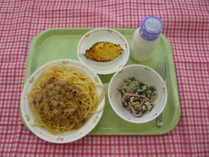 *今日のスパゲティは、ツナと大根おろしを醤油味で煮たものをかけてあります。大根は今から6000年前のエジプトでピラミッドの建設にあたっていた人々が食べていたという記録があります。日本の大根は種類が多く大型です。ビタミンCが多く含まれ、特に葉の部分に多く含まれているので工夫して食べるようにしましょう。消化を助けるビタミンUも含まれています。