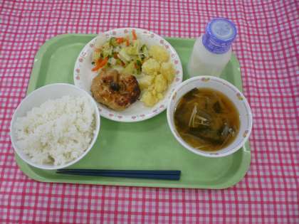 *今日のハンバーグは鶏肉と豚肉を合わせたハンバーグで、シメジを入れた醤油味ベースのソースがかかっています。ハンバーグは子供たちの大好きな料理のひとつです。