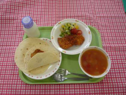 *今日は世界の料理特集でエジプト料理です。エイッシュというのはエジプトのパンです。給食ではトルティーヤをだしました。コズバレイヤは揚げた魚に香辛料のコリアンダーをきかせたトマトソースをかけたものです。バラデーはライムの香りのサラダ、ベセッラはトマト味のスープです。トルティーヤにおかずをのせて包んで食べました。