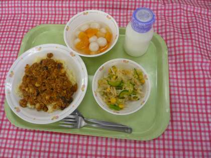 *今日のドライカレーには大豆をゆでたものを軽くつぶして煮込んであります。大豆があまり得意でない人にもカレーの中に入っていると気にせずに食べられるようです。豆類に抵抗があっても、ちょっとした工夫でとることができます。