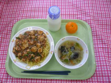 *麻婆豆腐を中華麺にかけた料理です。麻婆豆腐は19世紀に中国の北の方の四川省のある食堂の陳さんというおばさんが考え出したといわれています。お金が払えないような人にも食事をだしたという心優しい人で、中国語でマーというそばかすがあったことから、マーおばさんの作った豆腐料理ということで、麻婆豆腐と名付けられたそうです。