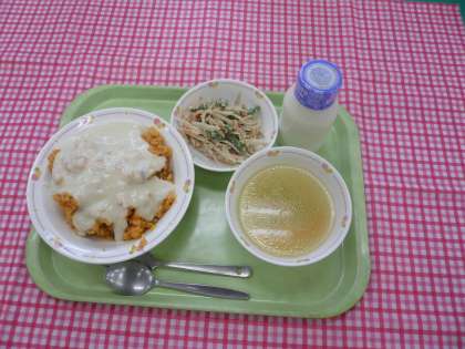 *今日はチキンライスにベシャメルソースをかけて食べます。サラダはゴボウにごまをたっぷり使ったソースであえてあります。ゴボウは平安時代から日本人が野菜として作っていたそうです。食物せんいがたくさん含まれ、体の調子を整え、血液の流れを良くし、若さを保つ食べ物です。
