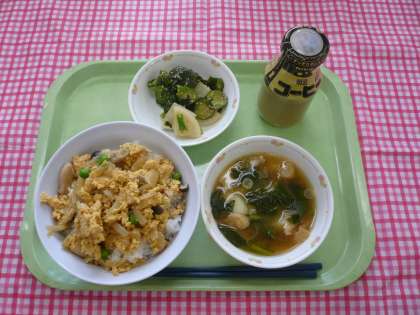 *今日はリーザーブ給食でした。焼き肉丼か親子丼を事前に選びました。全校で焼き肉丼が約200人、親子丼が約150人でした。自分が選んだ給食を楽しみました。
