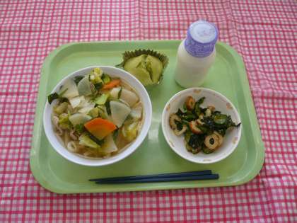 *今日から3学期の給食が始まりました。1月7日は七草の節句といわれています。春の七草は「せり、なずな、ごぎょう、はこべら、ほとけのざ、すずな、すずしろ」のことをいいます。7日は過ぎてしまいましたが、給食で七草全部ではありませんが、野菜をたっぷり入れたうどんがでました。