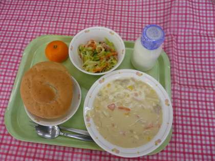 *今日は1年生のリクエスト給食です。シチューのリクエストでした。シチューとはどういう意味なのか辞典で調べると、料理のことが書かれていますが、本来の意味は「閉め切った暑いところで汗をかく」つまり、サウナ風呂という意味だそうです。これが15世紀くらいになって、煮込み料理をさす言葉として使われるようになったそうです。