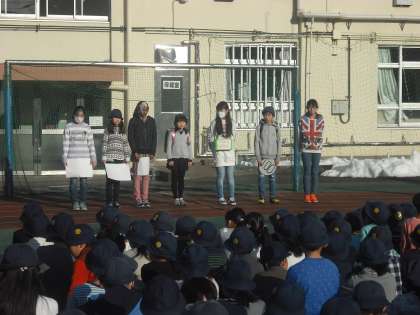 6年生が元気よく挨拶をしました。代表委員会の児童からお知らせをしました。1月30日から2月2日までユニセフ募金を行います。ご協力お願いします。