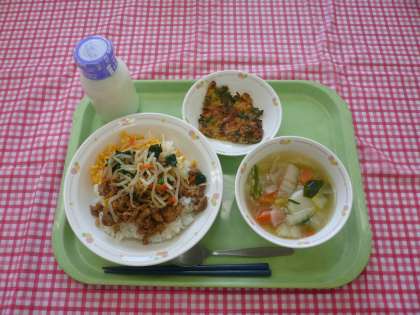 *今日はピョンチャンオリンピックを応援するために韓国の料理の献立です。ビビンパはごはんの上に甘辛味のピリ辛の味噌味の豚肉と炒り卵と野菜のナムルをのせてまぜて食べます。ビビンパというのは面白い名前ですが、正確にはピビンパフというようで、ピビンは混ぜる、パフはごはんという意味だそうです。