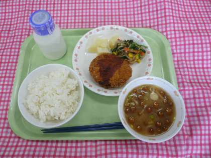 *今日のメンチカツにはおからが入っています。おからは豆腐を作るときに使う豆乳の絞りかすです。水に浸した大豆に水を加え砕き、煮た後に布袋に入れ、圧搾してこすと豆乳ができます。このとき、布袋に残ったかすがおからです。タンパク質、ししつ、繊維質が多く体によいものです。肉の中に入れて使うと、柔らかい食感になりおいしくなります。