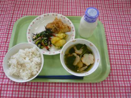 *今日はサバを揚げて、大根おろしの煮たものをかけてあります。さばの脂肪にはイコサペンタエン酸が多く含まれていて血管をきれいにする働きがあります。また、赤褐色の部分にはビタミンB1,B2が多く含まれています。