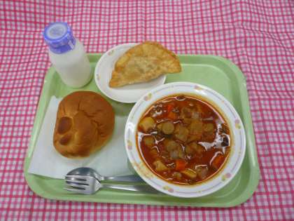 *今日は世界の料理特集でブラジル料理です。フェイジョアーダというのは、黒豆と豚肉の煮込み料理です。トマト味で、コリアンダーなどいろいろな香辛料を使っています。ヒソーリスはブラジル風揚げギョウザです。中身は豚肉、玉葱、にんにく、ココナッツ、チーズが入っています。クミンというカレー風味の香辛料を使っています。