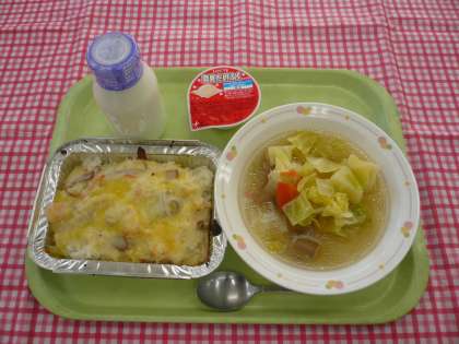 *今日はシーフードのクリームソースをごはんにかけてチーズをのせ焼いてあります。ポトフは肉やソーセージと野菜を煮込んだフランス料理のスープです。野菜をたっぷり食べましょう。
