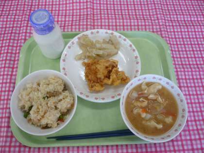 *今日は日本の郷土料理です。今日は大分県の料理です。鶏めしというのは鶏肉とゴボウが入った混ぜごはんです。とり天は鶏の胸肉のてんぷらです。いり大根は大根のコマみそ和え。だんご汁は小麦粉で作っただんごを平たくのばしたものをいれた味噌味の汁です。