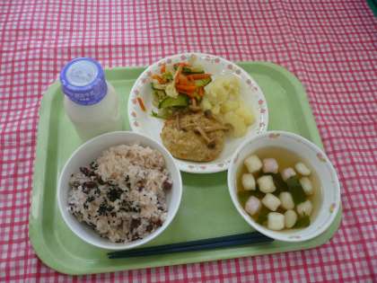 *今日は1年生の入学お祝い献立です。日本ではお祝い事にお赤飯を炊いてお祝いをします。ささげという豆をゆでた赤い汁と豆をいれて餅米を炊きます。昔、あかまいという外側が赤い米を神様にお供えしました。それがお赤飯に変わっていきました。