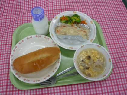 *今日は世界の料理特集でフランス料理です。クレーム・ド・ポアソンは蒸し魚のベシャメルソースかけです。レギューム・ソテは緑黄色野菜のバター炒めです。ミルファンティはフランスのかきたまスープです。粉チーズが入っています。