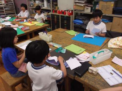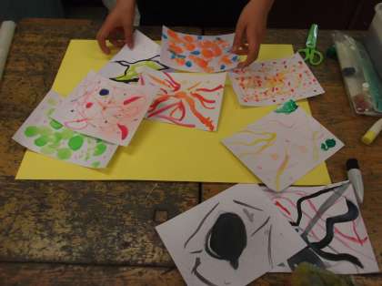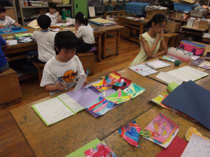 5年生の図工では、色や形、表し方を工夫して、自分の気持ちを表現する抽象表現に挑戦しました。できた気持ちのカードを並べて、組み合わせ方を考えました。