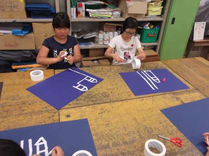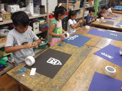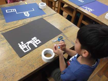 3年生の図工では、白いガムテープをちぎってできた線を使って、画用紙にお城を描きました。色を塗るのが楽しみです。
