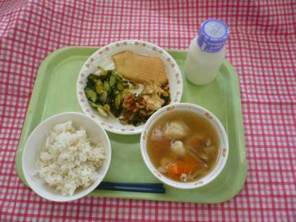 *今日は日本の郷土料理特集で岩手県の料理です。ひっつみというのは小麦粉の団子(すいとん)を入れた野菜たっぷりのおつゆです。昔、お米が少ししかとれない頃、年貢として出さなくてはいけず、自分たちは粉の団子を主食としていました。そのほか、特産のイカやコブやワカメの料理を付け合わせとしました。