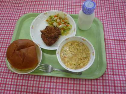 *変わりチキンカツは鶏肉に玉葱のおろしたもの、ヨーグルト、カレー粉、卵などの下味をつけ、パン粉をつけて揚げています。ヨーグルトは濃縮した牛乳に乳酸菌を植え付けて発酵させた物です。そのまま食べるだけではなく、料理にもよく使われます。
