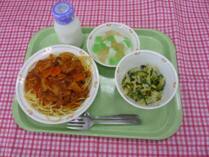 *今日のデザートはアジサイゼリーです。今あちらこちらでアジサイがきれいに咲いています。青やピンクなどいろいろな色をしています。それをイメージしてピンク、白、緑の四角いゼリーを混ぜています。カラフルで涼しげで今の季節にぴったりのゼリーです。