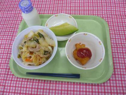 *アメリカンポテトはじゃがいもを蒸してケーキミックス粉をつけて揚げた物です。じゃがいもは給食でもよく使われていますが、南アメリカのアンデス山脈の高地が原産地です。日本では北海道で多く作られています。じゃがいもはビタミンCが多く含まれています。