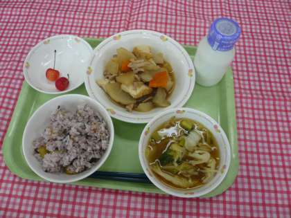 *黒米ごはんは白米に少量の黒米を入れて炊いていますが、白米がきれいな紫色になります。黒米は玄米の皮がアントシアニン系の紫黒色を含む品種のお米で、中国では古くから栽培されており漢方薬として使われました。白米と比べて栄養価が高く、ビタミンB1は約4倍、B2は約6倍、鉄分は約3倍、カルシウムは約4倍、食物繊維は約7倍含まれています。