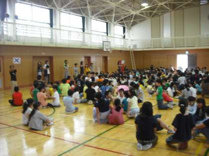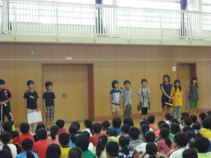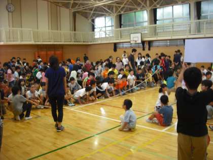 集会委員会が中心になって、○×ゲームを行いました。1問目は、西巣鴨小学校で飼っているウサギの名前はコーヒーとシュガーである、○か×かです。