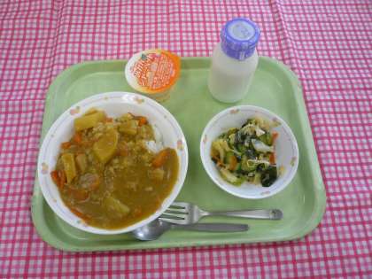*今日のデザートのシャーベットは、アラビア語の「シャルバート」からきているそうです。果物などから作ったシロップを水で薄めて氷で冷やした飲み物を意味する言葉で、氷菓子の仲間です。乳固形分3、0%未満の凍ったお菓子です。さっぱりしていて暑いときにはおいしいですね。