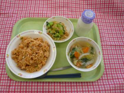 *今日はキムチが入ったチャーハンです。キムチというと、白菜を使った物が代表的ですが、キュウリや大根などいろいろな野菜でも作ります。朝鮮ではキムチを作るのに、お金をかけ、キムチを作る時期を「キムチャン」とよんで、年中行事のひとつになっています。