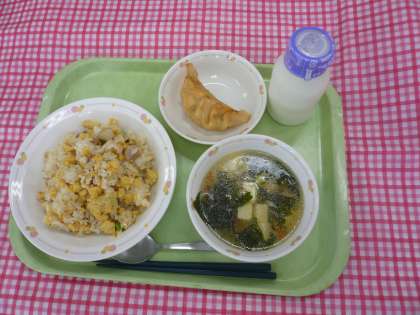 *今日のチャーハンには炒り卵が入っています。卵は手軽に使える食品で、朝食で食べたりしていると思いますが、いろいろな栄養がバランス良く含まれているので「完全食品」といわれ、栄養満点の食品です。卵のタンパク質には全部のアミノ酸がそろっているので、理想のたんぱくとよばれ、タンパク質の王様です。