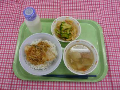 *魚の揚げ煮丼はメルルーサを揚げてごはんの上にのせ、薄い味のタレをかけてあります。メルルーサは時々給食で使われます。南米やアフリカ、ニュージーランドの沿岸などでとれる深海魚です。水深200〜400mに生育しています。スズキに似ていますが、大きなとがった口が特徴的です。大きな物になると1〜2mほどです。淡泊な味でタラに似ています。